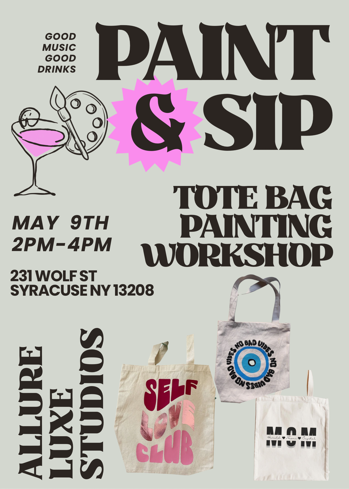 Join us for an elevated tote bag painting workshop just in time for Mother’s Day. Create your own custom bag using our stencils and guided inspiration, enjoy great music, and unwind at Allure Luxe Studios. You’ll leave the same day with your masterpiece!